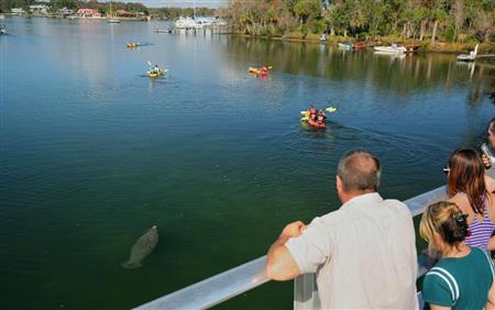 メキシコ湾に面したフロリダ半島北西部の町「クリスタルリバー」。早朝暗いうちに入り江へと静かにボートを出す。ウエットスーツに着替え、定刻の午前7時と同時に水温20度ほどの冷たい水へと入る。水中をのぞき込むと、褐色の水草に覆われた薄暗い水の底に、体長3メートルほどの丸々とした灰色の巨体が何体も横になっていた。絶滅危惧種として知られる海洋哺乳類のアメリカマナティーたちだ。寝ていても呼吸のため約15分に1回水面に顔を出すが、睡眠中にやってきた訪問客にはまったく興味なさそうに、再び水の底へと沈んでいった。