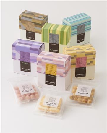 あられ本来のおいしさを無農薬、無化学肥料でつくられた安心、安全の食材を使って探求し、とりどりの色と形も楽しい48種類にも及ぶ味わいと食感が待ち受ける。機能性と日本的な贈答文化にも堪える品格を備えた斬新なパッケージに包んで、印象的なネーミングとともに新しい価値を運んでくる。