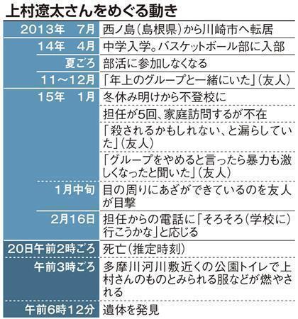 川崎市川崎区の多摩川河川敷で川崎区の中学1年、上村(うえむら)遼太さん(13)が遺体で見つかった殺人、死体遺棄事件で、神奈川県警川崎署捜査本部は26日、事件に関わった疑いがある少年数人を特定、近く一斉に事情聴取する方針を固めた。