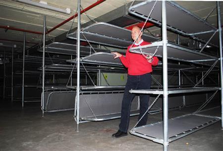 地下に降りると、薄暗い空間に4段の折りたたみ式ベッドを備えた鉄の枠組みがぎっしりと並んでいた。ベッドといっても鉄パイプの枠に布を張った簡素なもので、長さは約170センチ。案内してくれたベルンハルト・シュッテ館長(60)は「僕の身長は190センチだよ」と笑いながら語った。