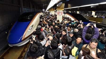 首都圏と北陸を直結する北陸新幹線が14日、開業した。1997年10月に東京-長野が先行開業したが、新たに金沢まで延伸。金沢-長野は228キロで、新幹線の北陸到達は1973年の整備計画決定から42年を経て実現した。最速タイプの「かがやき」が東京-金沢を最短2時間28分で結び、これまでの上越新幹線と在来線の乗り継ぎより最大1時間23分の大幅短縮となる。沿線自治体間の交流拡大やビジネスの活性化などが期待されている。