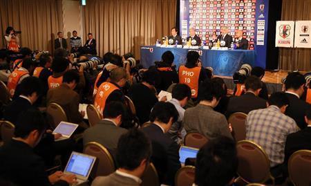 サッカー日本代表のバヒド・ハリルホジッチ新監督(壇上の右から2人目)の来日会見には多数のメディアが詰めかけた=2015年3月13日、東京都港区(中井誠撮影)【拡大】