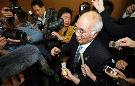 任期途中での辞任を表明した全国農業協同組合中央会(JA全中)の万歳章(ばんざい・あきら)会長。記者会見後、報道陣に囲まれた=2015年4月9日、東京都千代田区(早坂洋祐撮影)【拡大】