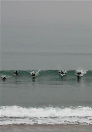 沖に目を転じると、遠浅の砂浜に向かって、海の波が階段状に寄せていた。その波のうねりに誘われて、たくさんのサーファーが繰り出している=写真。