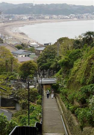 由比ガ浜、材木座の海岸線を望む参道の石段は、アジサイが咲いていなくても素晴らしい眺望だ=写真。とりわけこの季節は新緑と海のコントラストが見事なのだが、訪れる人はまだ、それほど多くない。アジサイシーズンの梅雨になると、あふれるほどの人と傘で埋まる。今年もさぞや…と思っていたら、こんな看板が出ていた。