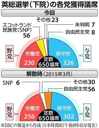 一方、地盤だったスコットランドを中心に25議席以上を減らした労働党のエド・ミリバンド党首(45)は敗北を認め、辞任を表明した。保守党と連立与党を組んでいた自由民主党も40議席以上減らし、副首相を務めるニック・クレッグ党首(48)が辞意を明らかにした。