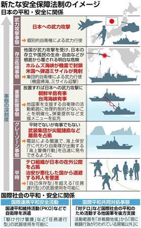 A 柱になるのは集団的自衛権の行使を限定容認した点だ。密接な関係にある国が攻撃されれば、政府は「存立危機事態」に当たるかどうかを判断する。日本の存立や国民の権利が危うくなるケースのことで、これに該当すれば自衛隊は他国軍と一緒に戦うことができる。
