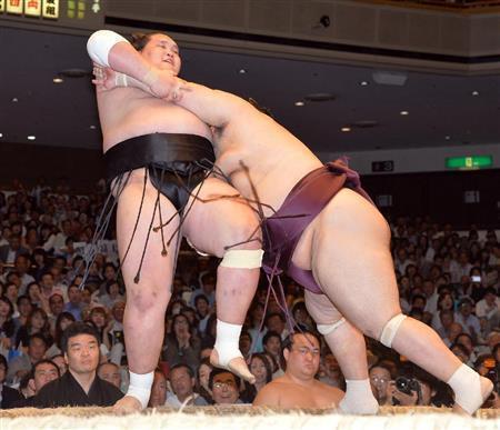 大相撲夏場所9日目が18日、両国国技館で行われ、2度目の7連覇を狙う横綱白鵬は関脇妙義龍をきめ出し、1敗を守って50場所連続勝ち越しとなった。横綱日馬富士(はるまふじ)が玉鷲(たまわし)に突き落とされ、関脇照ノ富士も徳勝龍(とくしょうりゅう)の寄りに屈し、ともに2敗に後退した。玉鷲は初金星。1敗でトップは平幕の魁聖、旭秀鵬(きょくしゅうほう)を合わせて3人に減った。