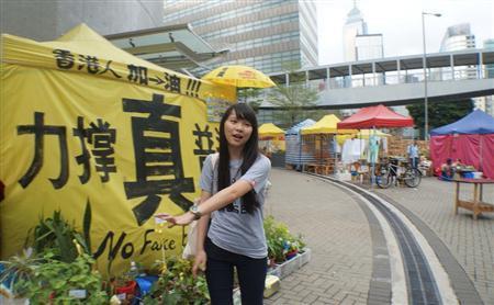 民主的な選挙制度を求めるデモの再開も視野に、テントが立ち並び始めた香港中心部、金鐘で、現場を案内する学生団体のメンバー、周庭さん=2015年5月18日、中国・香港(河崎真澄撮影)【拡大】