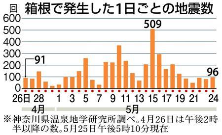 噴火警戒レベルが2(火口周辺規制)に引き上げられた箱根山(神奈川、静岡県)で、活動が活発になった4月26日から5月25日午後4時までに気象庁が観測した火山性地震は1810回に上り、2001年6月~10月の785回を大きく上回って観測史上最多を記録した。一方、気象庁よりも多くの地震観測地点を持つ神奈川県温泉地学研究所では25日4時までに4367回を計測。01年の4230回を上回り、こちらも史上最多となっている。