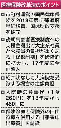 患者関連では、紹介状なしで大病院を受診した場合は、5000~1万円の自己負担を求める。また、入院時の食事代(現在260円)を、低所得者らを除き18年度から460円に値上げする。