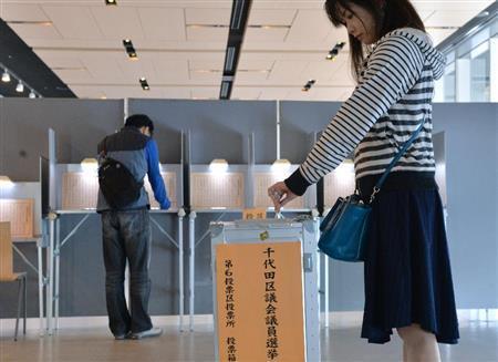 千代田区議会議員選挙で投票する有権者。来年には約240万人の未成年者が有権者に加わる見込みだ=2015年4月26日、東京都千代田区(栗橋隆悦撮影)【拡大】