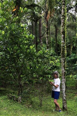コーヒー栽培を復活させたマリアナスコーヒー農園。直射日光を嫌うコーヒーの木は背の高いビンロウに守られるように栽培されている=2015年4月26日、米自治領・北マリアナ諸島のサイパン島(佐藤良一さん撮影)【拡大】