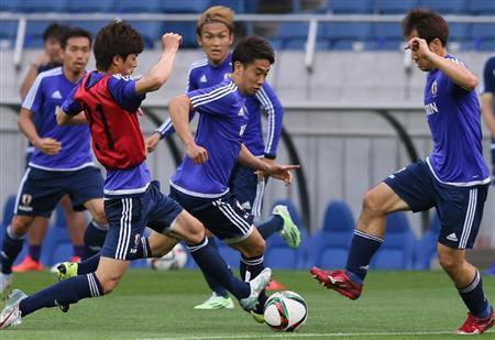6大会連続の本大会出場を目指す日本は15日、試合会場で最終調整した。ゲーム形式の練習で主力組は11日のイラク戦先発メンバーと同じ顔触れで、香川真司(ドルトムント)と柴崎岳(がく、鹿島)が中盤の高い位置に入る攻撃的な布陣を試した。