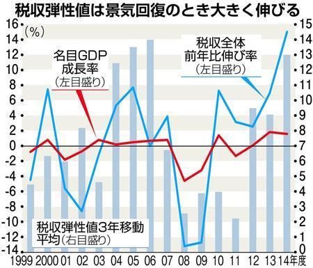 グラフは1999年度から2014年度までの一般会計税収の弾性値の推移である。デフレ期は経済の安定成長期に比べて税収が上下に大きく弾む傾向があるのだが、それにしても1や1.2~1.3というのは、きわめて低い。しかし、数字は微小でも政治的には大きな一歩である。