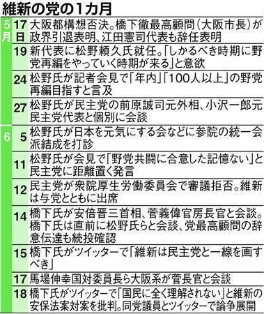 維新の党の路線対立が鮮明になっている。最高顧問の橋下(はしもと)徹大阪市長(45)が最近、安全保障に関する積極的な発信を再開。安倍晋三政権との関係も強めている。一方、19日で就任1カ月を迎える松野頼久代表(54)は、当初こそ民主党を含む野党再編の必要性を熱心に訴えていたが、日に日に求心力を失っている。9月の代表選もにらみ、党内は分裂状態に陥ろうとしている。