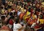 〔2〕両腕を頭の上に伸ばし、手のひらを合わせ、胸を大きく開き深い呼吸をする