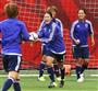〔1〕両足を前後に大きく開き、両足のかかとが一直線上になるように立つ。前足のつま先は正面に、後ろ足のつま先はやや外側に向ける