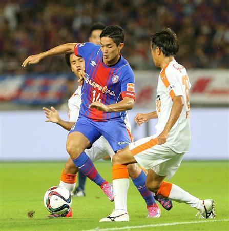 国内ラストゲームとなったFC東京・武藤嘉紀(よしのり、中央)=2015年6月27日、東京都調布市・味の素スタジアム(山田俊介撮影)