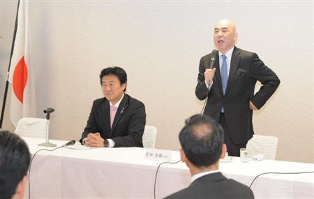 自民党の勉強会で挨拶する百田尚樹氏(右)。この時の発言は、安全保障に関する日本の戦後法制史の情けなさを端的に物語った=2015年6月25日、東京都千代田区永田町の自民党本部(斎藤良雄撮影)【拡大】