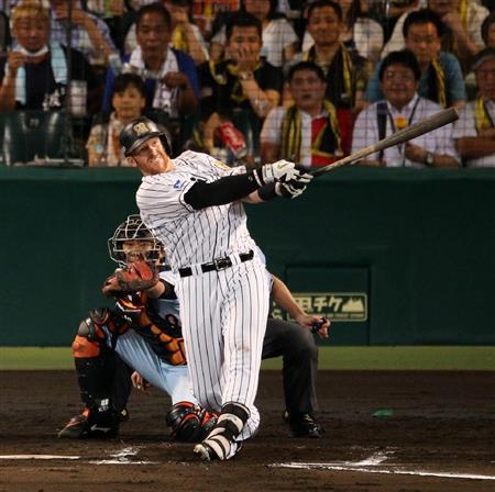 六回に適時二塁打を放つ阪神のマット・マートン=2015年7月21日、兵庫県西宮市・甲子園球場(白鳥恵撮影)