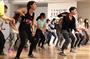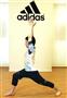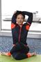〔1〕足を腰幅に開き、膝を深く曲げ両手を床に着き、ももと胸を近づけるようにして前屈をする。