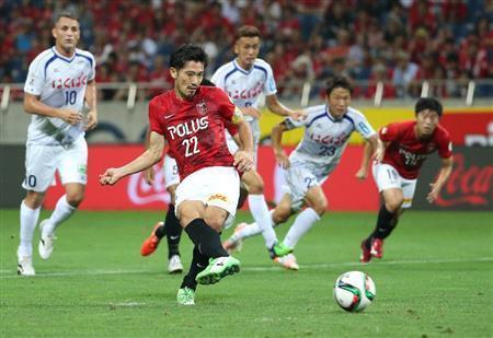 前半、PKを決める浦和・阿部勇樹(中央)=2015年7月29日、埼玉県さいたま市緑区の埼玉スタジアム2002(小倉元司撮影)【拡大】