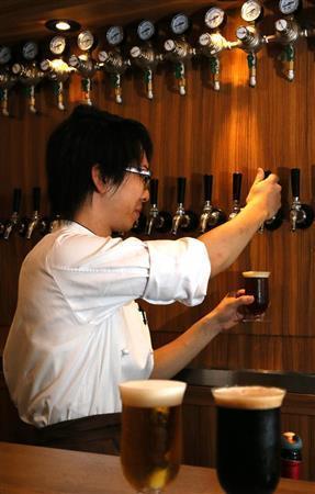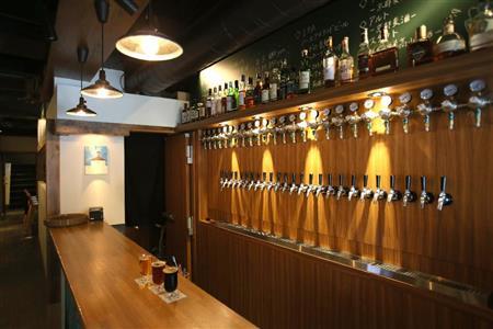 四条通に面した「クラフトマン」は、オフィス街の中心で京都市営地下鉄・四条駅のすぐ近くという好立地。ガラス張りの店に入ると、壁面に25のタップ(ビールサーバーの注ぎ口)が並び、壮観だ。どの種類を飲もうか悩んでいると「まずは『3種類飲み比べセット』(1500円)はいかがですか」とシェフの西川文啓さんに薦められた。