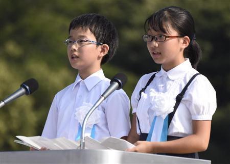 被爆から70年を迎えた「原爆の日」の6日、広島市中区の平和記念公園では「原爆死没者慰霊式・平和祈念式」(平和記念式典)が営まれ、約5万5000人(市発表)が犠牲者の冥福を祈った。松井一実市長が平和宣言を読み上げた。