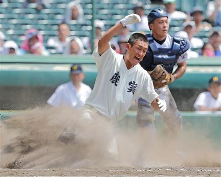 北海戦の三回、2点適時打でホームインする鹿児島実の安藤優幸=2015年8月6日、兵庫県西宮市・甲子園球場(村本聡撮影)【拡大】