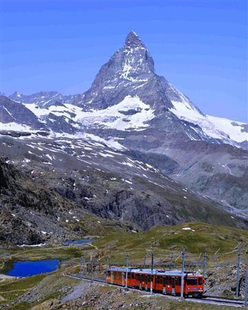 氷河特急の終点ツェルマットの街(1620メートル)からゴルナグラートの頂上(3089メートル)まで、マッターホルンを眺めながら一気に登るゴルナグラート鉄道。山道が整備されているので帰り道は池を廻りながら散歩するのも楽しい=2015年7月5日、スイス・ヴァレー州(唐木英明さん撮影)【拡大】