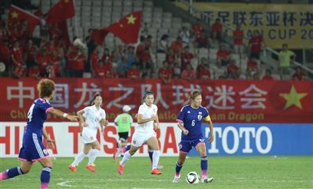 8月8日、サッカー東アジア杯の女子最終戦、日本対中国戦で、ボールをキープする日本代表の川村優理(ゆうり)主将。この日、競技場内では、場所取りをめぐって日本人カメラマンが「駆逐」されるという騒動が起きた=2015年、中国・湖北省武漢市・武漢体育中心(彦野公太朗撮影)【拡大】