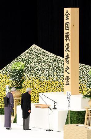 70回目となる終戦の日を迎えた15日、政府主催の全国戦没者追悼式が東京都千代田区の日本武道館で開かれた。追悼式には、天皇、皇后両陛下ご臨席のもと、安倍晋三首相や戦没者遺族5327人が参列。戦争の犠牲となった軍人・軍属約230万人、一般市民約80万人の計約310万人の冥福を祈り、平和への誓いを新たにした。