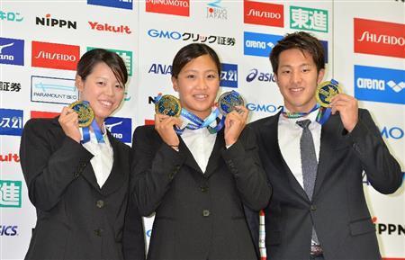 世界選手権で獲得した金メダルを見せる(左から)星奈津美、渡部香生子(わたなべ・かなこ)、瀬戸大也(だいや)の3選手=2015年8月11日、東京都北区・味の素ナショナルトレーニングセンター(納冨康撮影)【拡大】