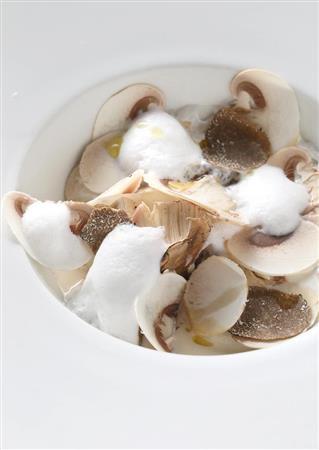滋賀県産の鹿肉をローストした一皿は、青じそと赤じそがサラダ風にふんわりと盛りつけられ、添えられた山ワサビとバルサミコ酢のソースで味わう。コース料理に組み込まれることが多いというジビエ(野生の鳥獣肉)メニューは、「ヨーロッパやシンガポールから来日する旅行客に特に人気」(河合寛マネジャー)だそう。