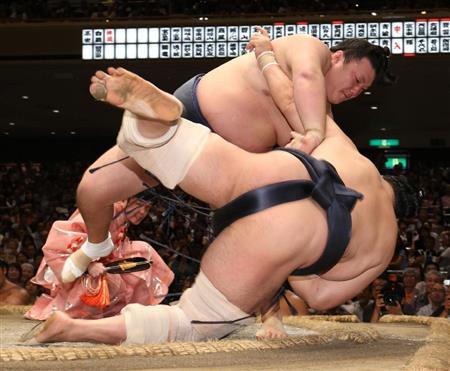 勢が抜群の反射神経を示した。立ち合いで左に変わった安美錦(あみにしき)に攻め込まれたが、土俵際で逆転の右小手投げ。「冷静に相手が見えていたから落ち着いて反応できた」。平幕の勝ち越し第1号だ。
