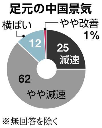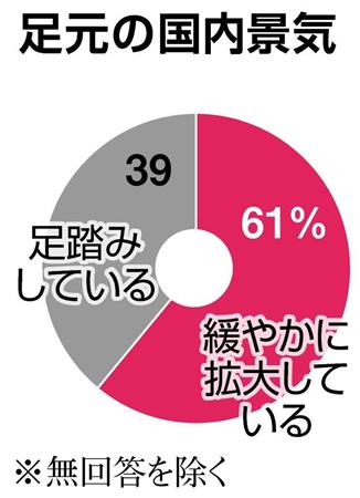 産経新聞社が118社を対象に23日まとめた主要企業アンケートでは、足元の国内景気について、「緩やかに拡大している」と答えた割合は、全体の61%と過半に達した。ただ、力強さに欠けるとの認識も目立ち、「足踏みしている」との回答も39%に上った。とりわけ、国内総生産(GDP)の約6割を占めている個人消費への懸念が根強い。