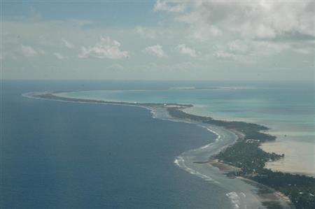 細長い環礁の内側には、エメラルドグリーンのラグーンが広がる=2010年6月1日、キリバス・首都タラワ上空から(今泉有美子撮影)【拡大】