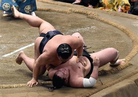 稀勢の里(きせのさと、左)に寄り倒された照ノ富士=2015年9月25日、東京都墨田区の両国国技館(今井正人撮影)【拡大】