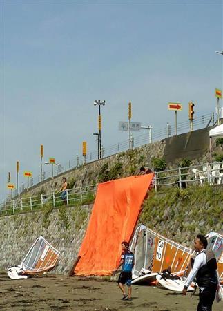 5日に鎌倉市内で行われた『津波が来たら高いところへ逃げるプロジェクト』では、材木座海岸を会場にして「オレンジフラッグ海上逃げ道体験」というイベントが新たに加わった。津波警報や大津波警報が発令されたら海岸にオレンジ色の大旗や垂れ幕を掲げ、マリンスポーツをしている人たちに視覚で海から戻るよう知らせる。そのための訓練だ=写真。