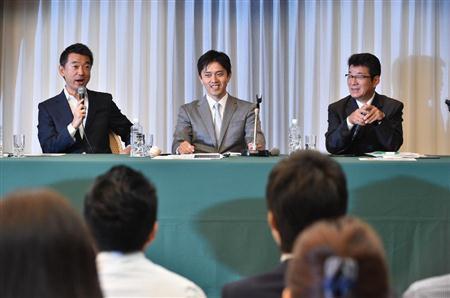 会見には新党の代表就任が有力な松井一郎府知事(52)が同席。再選に向けて松井氏が府知事選に、1日に議員辞職願を提出した吉村洋文(ひろふみ)衆院議員(40)=比例近畿=が市長選にそれぞれ立候補すると正式に表明した。