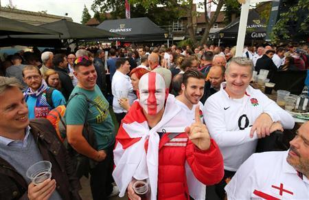 イングランド対フィジー戦の試合前、スタジアム近くのパブではビールを片手に盛り上がるファンの姿が見られた=2015年9月18日、英国・首都ロンドン(山田俊介撮影)【拡大】