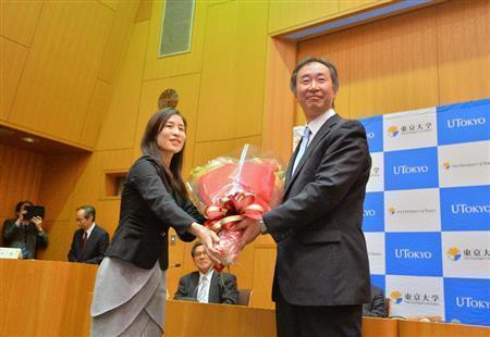 ノーベル物理学賞を受賞して、花束を受け取り笑顔を見せる、東京大宇宙線研究所の梶田隆章教授(右)=2015年10月6日夜、東京都文京区の東京大学(宮崎瑞穂撮影)【拡大】