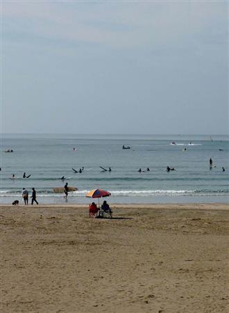 広い砂浜にビーチパラソルはぽつんと一つだけ。その向こうの海の方が、波を待つサーファーたちの姿で、むしろ人口密度が高い。うねりがあまり大きくないこともあって、ひねもすのたりのたり…(あれは春の海だったか、まあ、とにかく)、のんびりとした後継に心がほぐれる=写真。