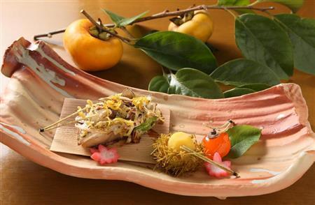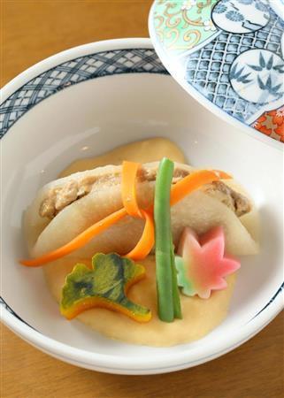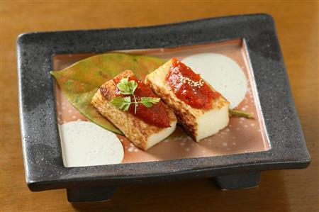 会席料理の先付として登場するのは「嶺岡(みねおか)豆腐田楽」。牛乳と葛(くず)を練ってつくられた嶺岡豆腐にみそがかけられた一品だが、このみそが凝っている。