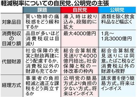 経理方式については、まずは現行の方式などを応用した簡易方式を導入して、数年後をめどに欧州型の本格的な経理方式「インボイス(税額票)」を導入する方向を確認した。最大の焦点となっている対象品目の選定については自民党が4000億円の財源の範囲内で「生鮮食品」(2%の軽減税率で3400億円の税収減)などに品目を絞り込む案を主張。