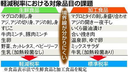ただ、4000億円の財源で対象品目を選定すると、最大でも「生鮮食品」(2%の軽減税率で約3400億円規模)しか賄えない。公明党が推す「酒類を除く飲食料品」に軽減税率を適用すると、税収は財務省の想定を年1兆3000億円程度下回る。公明党は、酒類を除く飲食料品の税率を8%にした場合の税収額が独自試算では約8400億円だと指摘したが、財務省は見積もりを変えなかった。