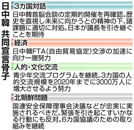 共同宣言では「歴史を直視し、未来に向かう精神の下、関連する諸課題に適切に対処」することで一致したと明記し、日中韓自由貿易協定(FTA)交渉を加速することも確認した。