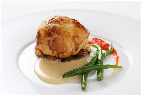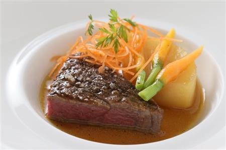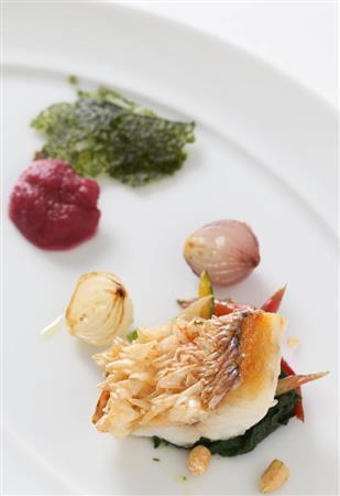 その言葉通り、提供される料理の数々も非日常を演出する質の高いものばかり。前菜である「ズワイガニとかぶらのサラダわさび風味」は、ズワイガニと京都の赤かぶと白いかぶらのマリネ、そしてリンゴを短冊状に切って盛りつけた見た目にも鮮やかな一品。下にはわさび風味のかぶらのムースが。