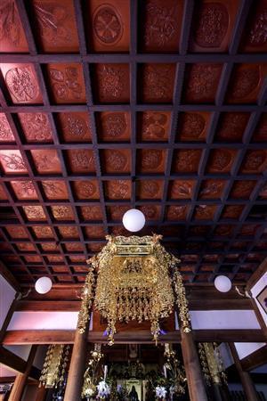 格天井の荘厳は、先代住職の七回忌(7月)に先立ち6月に完成。お盆やお彼岸、お会式など夏から秋にかけての行事が一段落したところで、今度は天井としての一般公開となった。